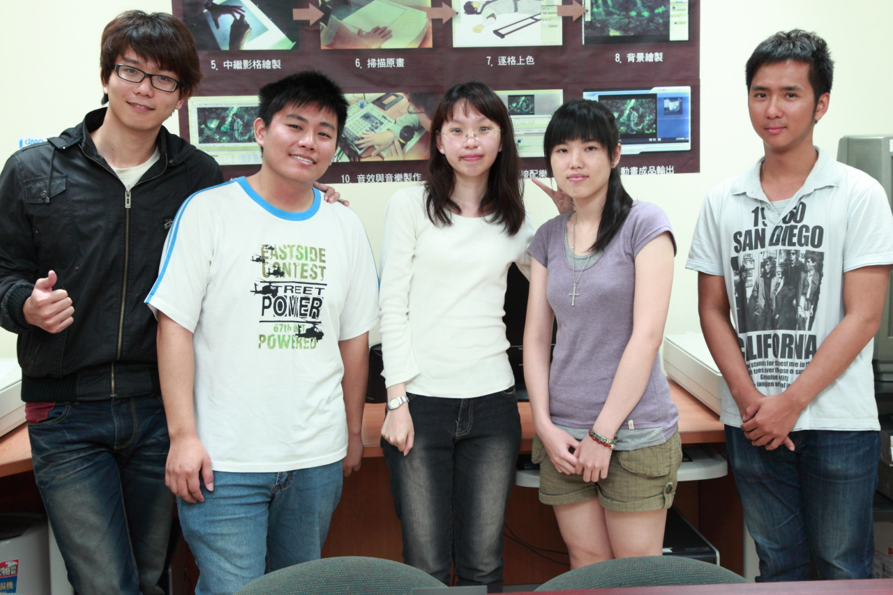 照片由左而右為:林明佳(程式、企劃)、汪瑞璽(3D美術)、林佳祺(程式)、林時如(2D美術)、楊潤航(特效)